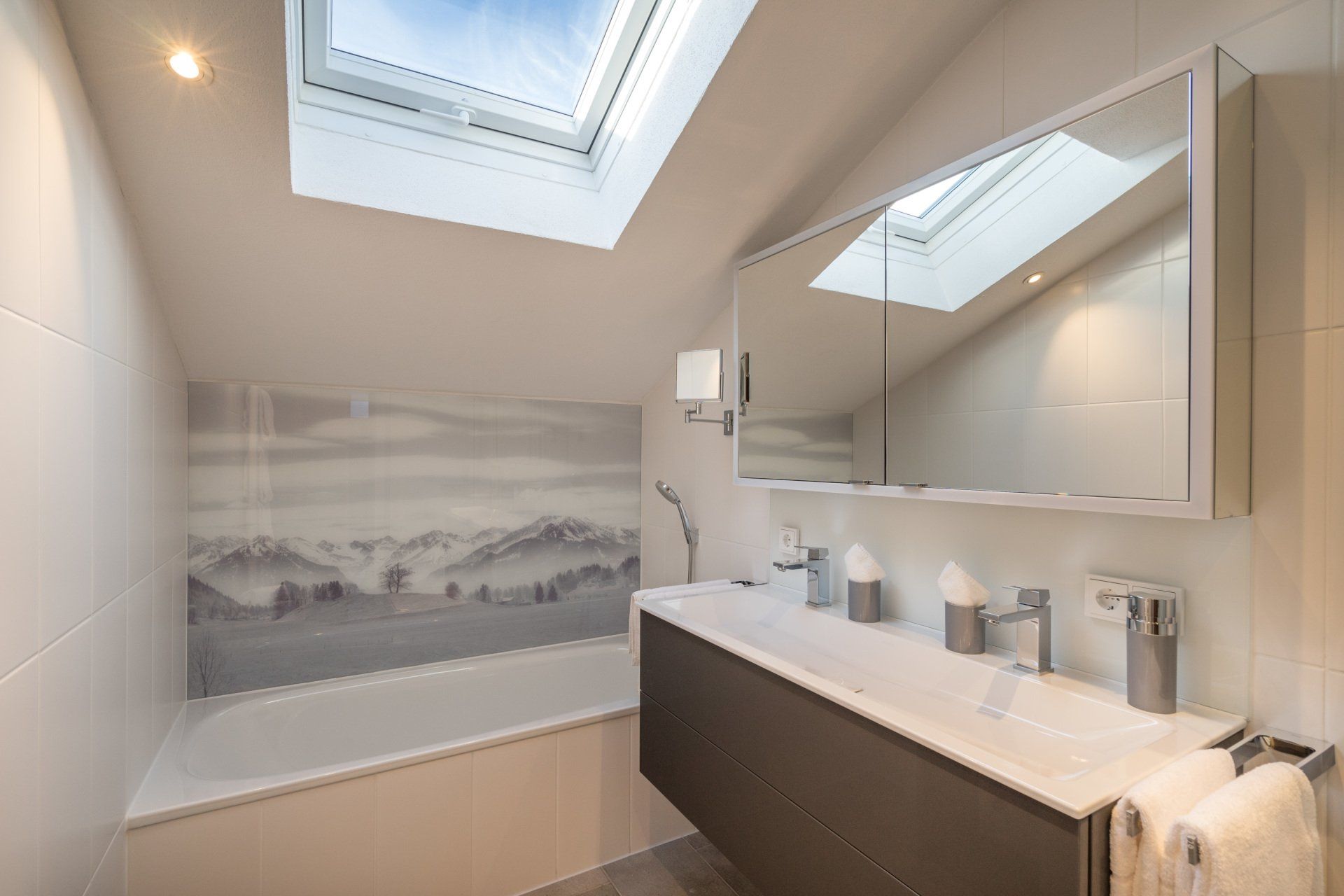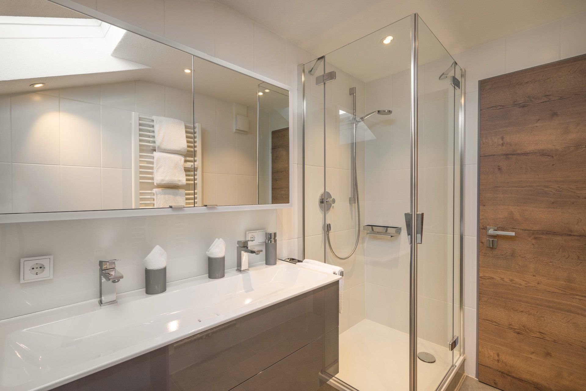 Das helle Badezimmer (WC separat) verfügt über eine Dusche, eine Badewanne, ein Doppelwaschbecken, einen beleuchteten Spiegelschrank und einen Handtuchheizkörper. Lassen Sie sich neben einer schönen Alpenpanoramaglaswand ein warmes Bad ein und genießen Sie die Entspannung vom Alltag.