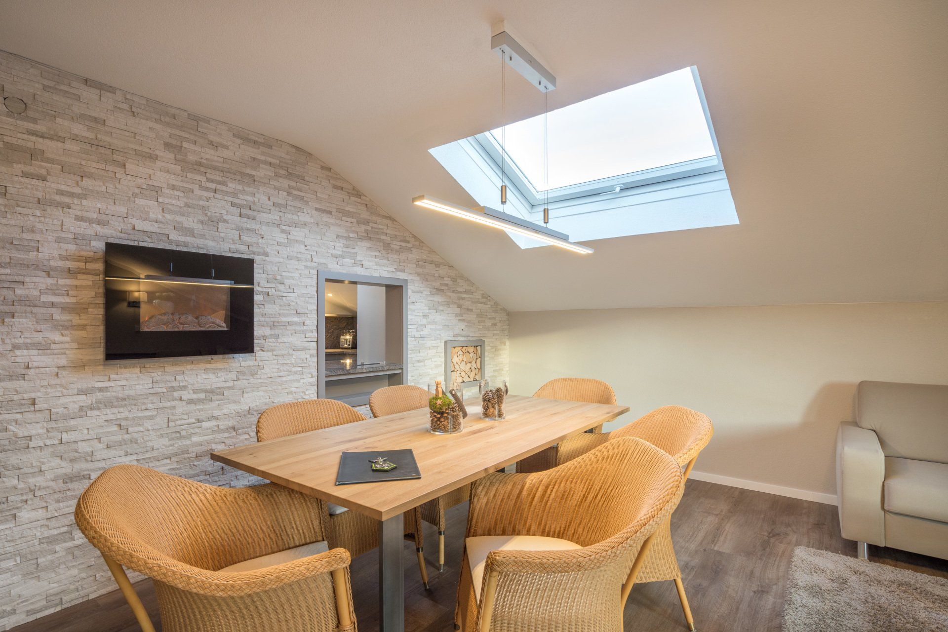 Der 27qm große mit einem Flachbildfernseher und einer bluetoothfähigen Stereoanlage ausgestattet lichtdurchflutete Wohn-Eßbereich verbindet ansprechendes Design mit alpenländischer Behaglichkeit. Er besitzt einen großzügigen Eßbereich mit sechs gemütlichen Loomchairs und einen edlen modernen Holztisch die zum Verweilen einladen - der ideale Platz für ein ausgiebiges Frühstück oder ein entspanntes Essen gemeinsam mit der Familie oder mit Freunden.